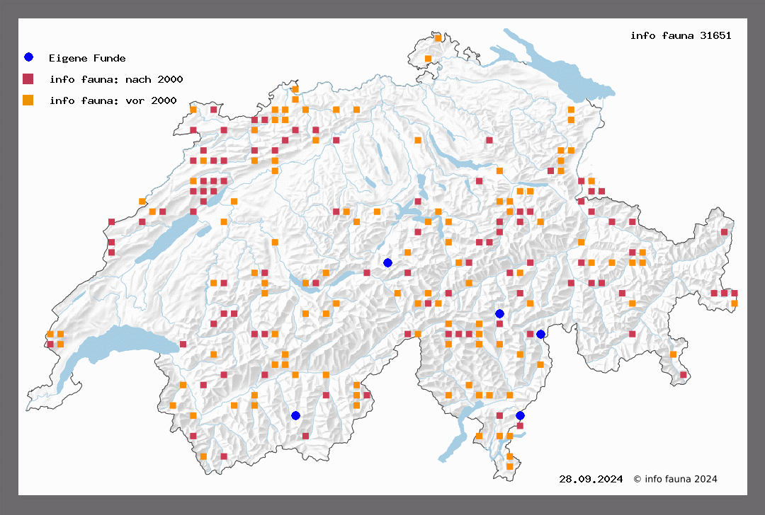 1010. affinitata Stph. (= inciliata Zett.) Sp. III, T 69. Wenig verbreitet und meist ziemlich selten. Flugzeit von Ende Mai bis Juli. Alpsigel (1768 m, Gröbli), Jorat ob Orvin (Roh.), Dombresson (Roug.), Tramelan (G.), Blauen im Jura (Honegg.), Büren (Ratz.), Weissenburgschlucht (Hug.), Gadmen (St.), Martigny (W.), Sion, Le Brocard (Favre), am 13. VII. 1906 auf einer feuchten Bergwiese bei Simpeln recht zahlreich (V.), Erstfeldertal (L.), Pontresina (Schlier), Trafoi, Samaden (Kill.), Alp Farur (Thom.), Ilanz (Caveng), Calfeisental (M.-R.).