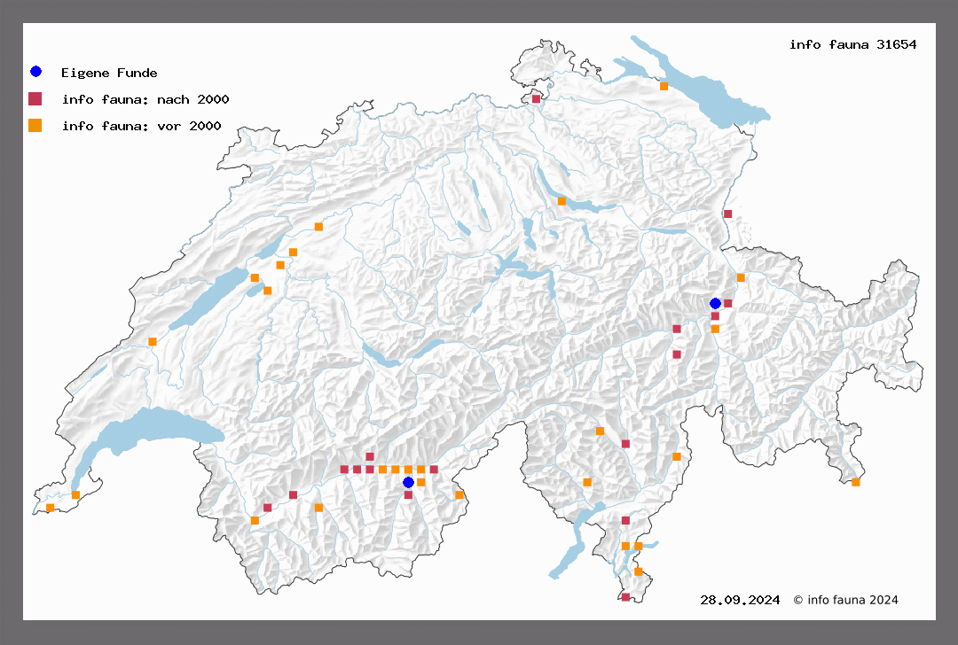 1013. unifasciata Hw. (= bifasciata Hw.) Sp. III, T 69. Sehr selten und vereinzelt von Mai bis August. Oberuzwil (Wild), Siselen, Büren (Ratz.), Bern (V.), Biel (Rob.), Dombresson (Roug.), Genf (Aud.), Martigny (W.), La Batiaz (M.-R.), Salgesch (Roug.), Simplon (Favre), Cresta-Thusis (Honegg.), Landquart, Lostallo (Thom.).