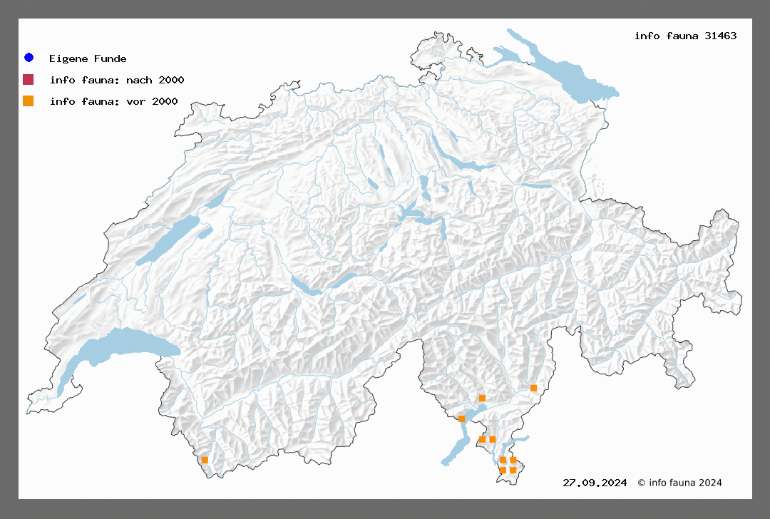 G. L. Schulz besitzt ein Stück, das er zwischen St. Luc und Vissoye, ein anderes, das er bei Iselle seiner Erinnerung nach gefangen hat. Die Raupe Dietze, Eupith. T 66 lebt im August an Ptychotis heterophylla, welche Pflanze zwar an kiesigen Orten am Genfersee vorkommt, dagegen dem Wallis fehlt. Das Vorkommen des Falters bedarf daher der Bestätigung. E. Sp. II, 69 Naturaliste 1904, p. 5 Iris XVI, 383 B. R. 362.