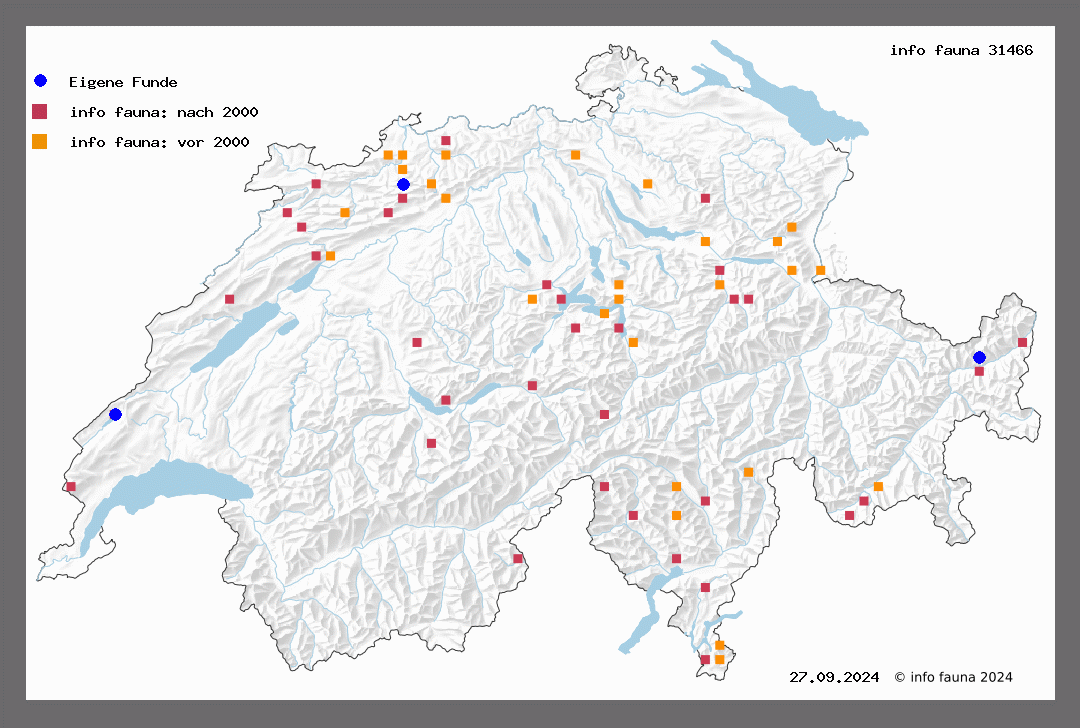 Habitat: | Wärmeliebende Art: warme, nicht zu trockene Täler mit reichlich Solidago virgaurea. Ideale Plätze sind besonders geschützt stehende Solidago-virgaurea-Bestände, die durch den Windschatten von Gehölzen oder Felsen vor zu schnellem Vertrocknen bewahrt werden. Ein gewisses Mass an gleichbleibender Luftfeuchte spielt dabei wohl eine der entscheidenden Rollen. An Solidago gigantea oder S. canadiensis wurde die Raupe nach WEIGT nicht beobachtet, obwohl beide Arten als Raupenfutter bei der Zucht angenommen werden. Nachweis: Raupensuche nachts an Basalblättern von warm stehenden Solidago virgaurea im August. |