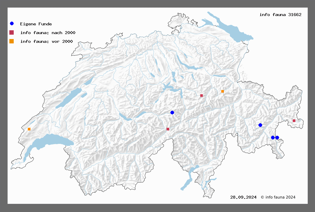 993. alpicolaria H. S. (= abstersaria H. S. = gentianata Mill.) Sp. III. T 69. Der seltene von Juni bis August fliegende Falter ist nur an wenigen Orten der Alpen und des höheren Jura beobachtet worden. Fetan, Bernhardin (Kill.), bei Davos selten am Jacobshorn ob dem Wald, wo Gentiana purpurea und punctata gedeihen. Val Revers (Hauri), Glärnisch (Nägeli), Fextal (Stierl.), Val Rosegg (Z.-D.), Albula (Gröbli), ob Weissenstein (Thom.), Pontresina, Zermatt (Püng.), La Forclaz (Aud.), Gotthard (M.-Dürl.), Mt. d'Amin (Roug.). Die Raupe Sp. IV, T 46 fand Püngeler bei Zermatt und im Engadin sehr zahlreich in den noch grünen Kapseln der Gentiana purpurea und punctata, de Rougemont im Herbst in den Kapseln von Gentiana lutea, am Mt. d'Amin im Jura.
