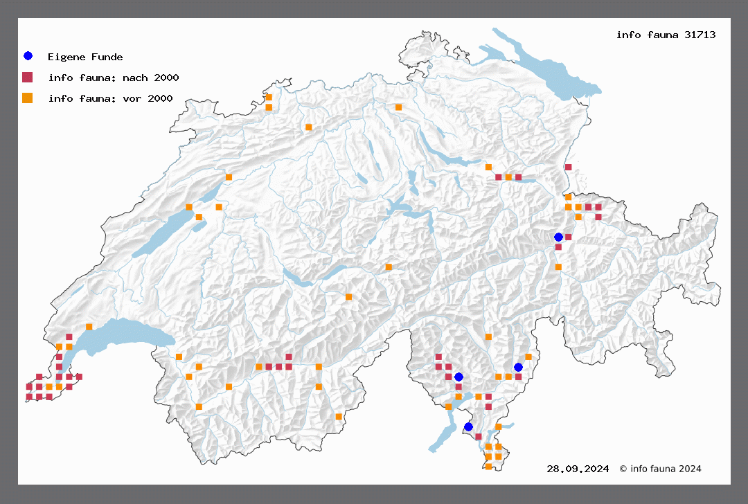bei Branson im August häufig (W.), Visp, Siders, Crevola (Jäggi), Salgesch (Roug.), Sion, Sierre (Paul), Lostallo VIII. 1911 (Thom.); Morcote (M.-R.), in einer auffallend gelblichen Form; Filisur (Uffeln). Die Raupe Sp. IV, T 40 lebt an trockenen Plätzen