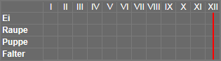 (Stichworte Präimaginalstadien: (Frasspflanzen, Mikroklima, Lebensraum Präimaginalstadien, Ablageverhalten, Frassverhalten, Verhalten, jahreszeitliche Entwicklung: Text fakultativ, ergänzend, falls im Phänogramm nicht sichtbar)