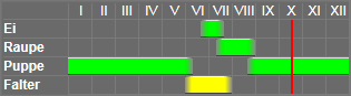 Die Art ist einbrütig, die Puppe überwintert.
