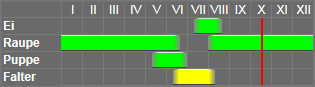 Die Raupe - Sp. IV, T 10 - lebt von Februar bis Juni an Prunus spinosa, Sorbus aucuparia, Crataegus oxyacantha, Pirus malus und communis; sie verbirgt sich über Tag in den Rissen der Rinde. Die Verpuppung erfolgt in einem leichten Gespinst an den Aesten der Bäume oder Sträucher. Die Falter erscheinen nach 3-4 Wochen.