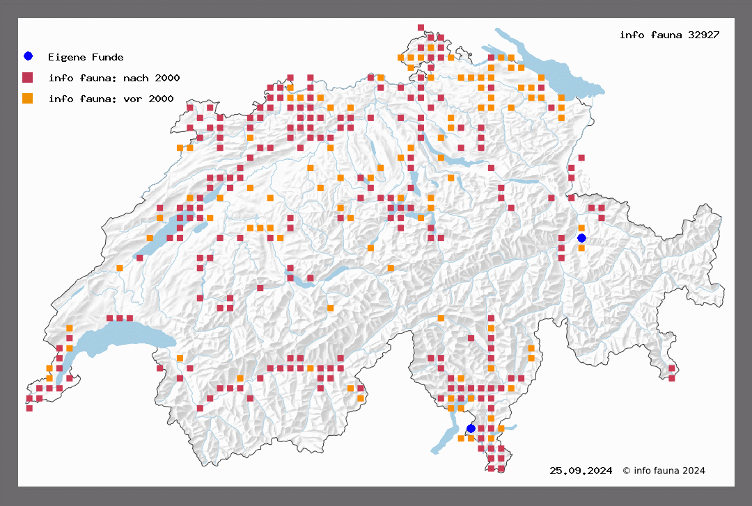 Ziemlich selten an warmen Stellen und weniger verbreitet als die vorigen Arten. Flugzeit vom Juni bis September. Bechburg (R.-St.), Neuveville (CouL), Biel (Beut.), Bern (V.), Gadmen (St.), Grassier (Loriol), Genf (Aud., V.), Martigny (W.), Sierre, Salgesch (Roug.), Lostallo (Thom., M.-R.), Sorengo, Mte. Generoso (Ghidini).