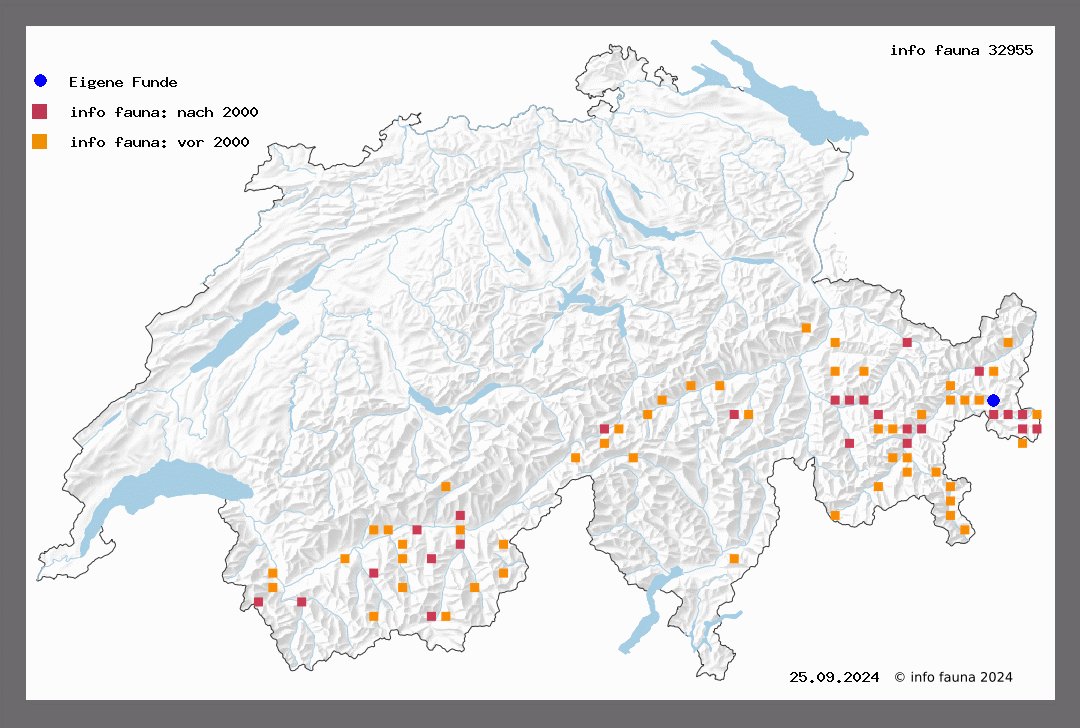 verbreitet (Kill.), Davos selten (Hauri), Bergün (Honegg.), Rugnux, Celerineralp (V.), St. Moritz öfter (Püng.), Val Fain, Sils (Frey), Ofenpass, Fuldera, Manas (Thom.). Yättis (M.-R.), Umgebung von Sion und Sierre (Paul), Laquintal (Rcätz.),