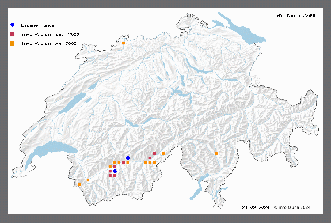 Sehr selten im Wallis und der südlichen Schweiz. Flugzeit im Mai. Saleve (Corcelles), Gamsen (And.), Martigny (W.), Binnental 2. VII. 1900 (Favre), Biasca (V.).