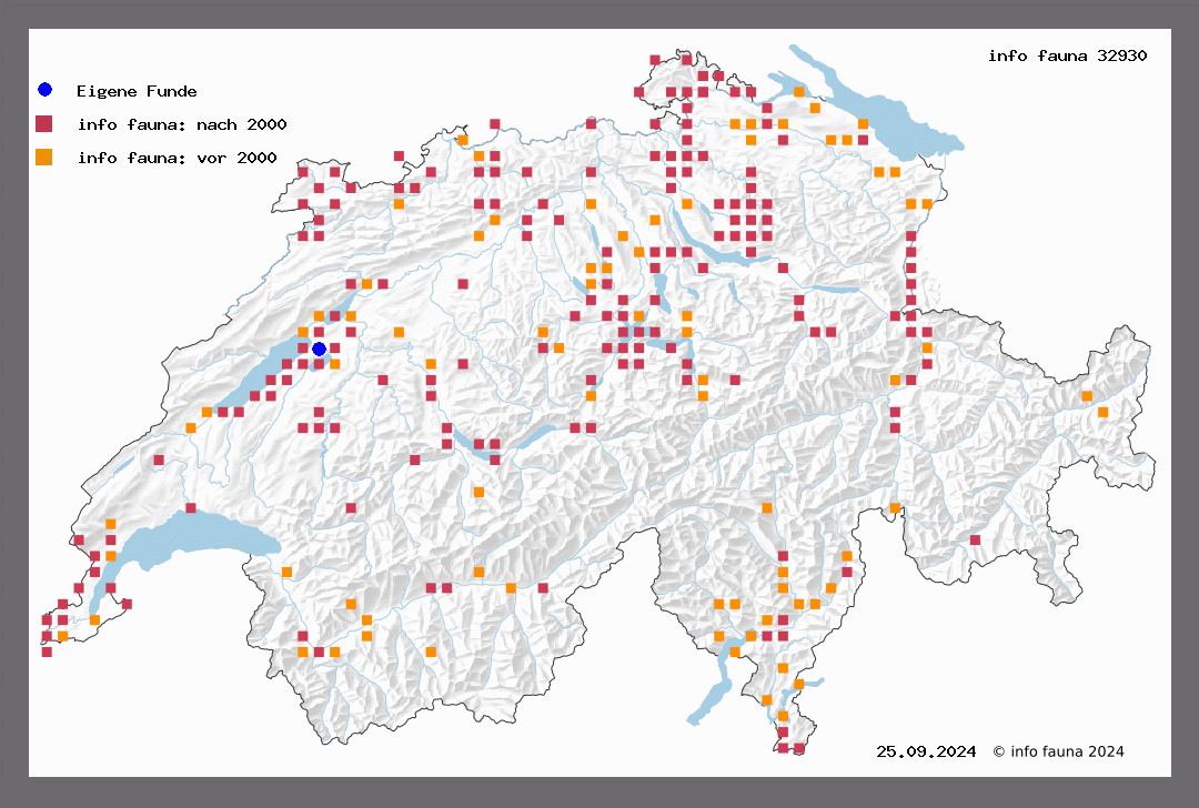 Verbreitet ähnlich der vorigen Art, aber spärlicher als jene. Flugzeit von Juli bis September; die Falter saugen am Tage an Cirsium, abends sind sie am Köder zu fangen. St. Gallen (M.-R.), Frauenfeld (Wehrli), Zürich (Hug., V.), Uto (Nägeli), Waid, Dübelstein (Rühl), Lenzburg, Oftringen, Engelberg (W.), Bechburg (R.-St.), Neuveville (CouL), Biel (Rob.), Siselen, Büren (Ratz.), Schupfen (V.), Bern (v. J.), Weissenburgschlucht (Hug.), Yverdon (Roug.), Conche (Aud.), Martigny, Mt. Ravoire, Mt. Chemin (W.), Centovalli (Z.-D.), Chiasso (Fontana), Landquart, Lostallo in Mehrzahl (Thom.), Chur, Tarasp, Fetan (1638 m. Kill.), Erstfeld (Hoffm., L.).