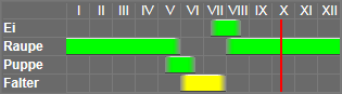 Die Raupe - Sp. IV, T 11 - lebt an Flechten und Lebermoosen und wächst langsam heran. Sie birgt sich über Tage zwischen trockenem Laub am Fusse von Eichen oder in den Rissen der Rinde, wo sie auf sonnigen Waldblössen auch im Herbst und Winter zahlreich erbeutet werden kann. Nach der Ueberwinterung verpuppt sie sich in einem leichten