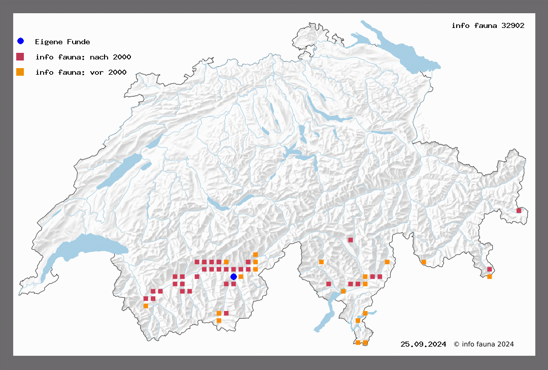 Nur im Wallis und den Südtälern, aber von Juni bis September dort an warmen Halden nicht selten. Der Falter fliegt zahlreicher in den frühen Morgenstunden und gegen