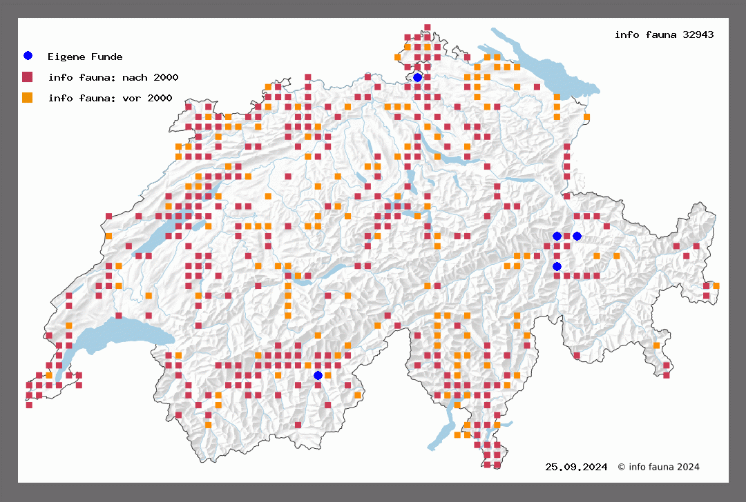 In allen tieferen Landesteilen verbreitet, vereinzelt bis ins Davosertal hinein (Hauri) und bei Zermatt (Püng.). Sehr gemein ist das Tier am Südfusse des Jura, und in manchen Jahren in Bern am Licht. Der Falter fliegt im Juli-August, er ruht über Tag auf oder unter Blättern an Büschen. U. N. M. J. W. S. G.