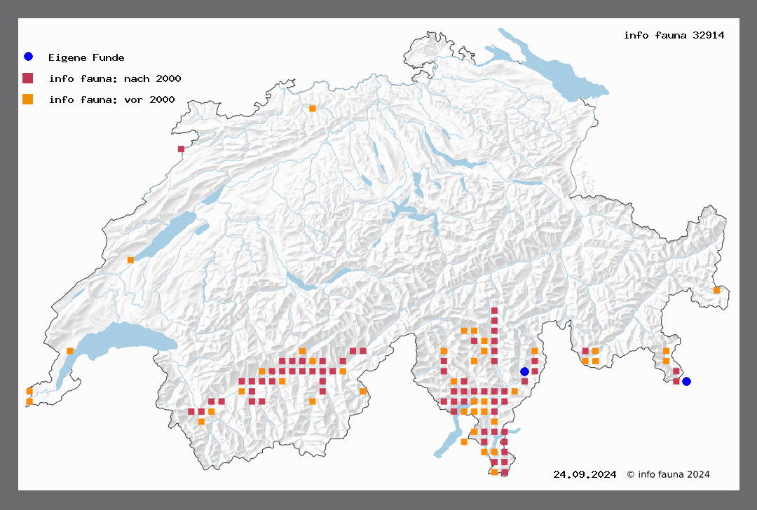 Eine nur im Wallis und der Südschweiz ständig vorhandene Art. Sie ist zwar auch nördlich der Alpen gefangen worden, aber nur in sehr vereinzelten, vielleicht zugewanderten Stücken. Flugzeit von Mai bis Juli. St. Niklaus, Stalden (V.), Visp (Stdfs.), Sion (Gröbli), Sierre (Paul), Brig (Favre), Lenk (v. J.), Branson, Martigny (W.), Vernayaz (V.), Geneve (Blach.), Pt. Saleve (Musch.), Useigne (Steck), Lugano (Ghidini), Lostallo öfter (M.-R.), Bignasco (v. J.), Chiasso (Mayer), Bergell öfter (Bazz.), Poschiavo (Seim., Stieii.), im Münstertal (ca. 1400 m, Thom.), Stans-Staad 1 Stück am 14. VII. 1910 (v. J.), Yverdon (Meisn.), Glarus (Heer), Frauenfeld 1 Stück 1893 (Wehrli), St. Gallen einmal (Scheitl.).