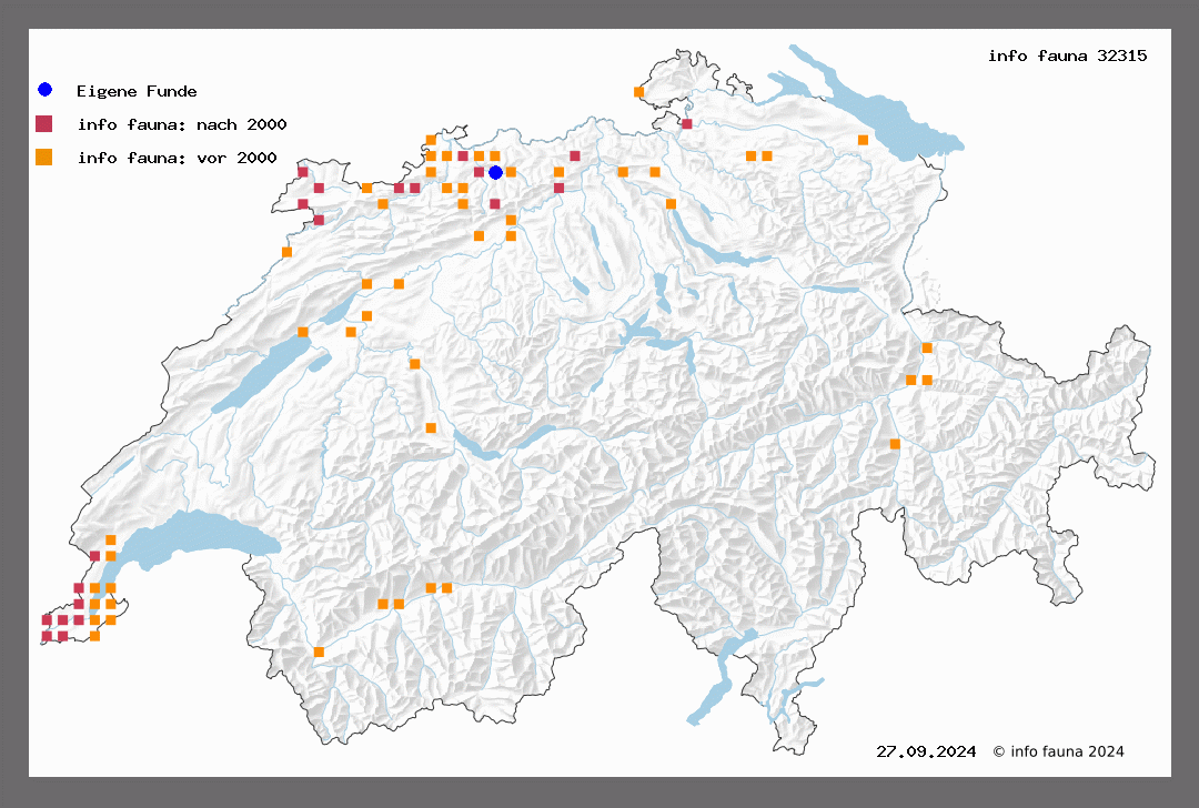 761. fulminea Sc. (= paranympha L.) - Sp. III, T 53 - B. R. T 38. Der Falter wiederum in weitester Verbreitung durch alle tiefern Landesteile, von Juli bis August; in den Voralpen bis über 1400 m (Wiesen, Hauri). Er ist in der Regel nicht häufig. St. Gallen (M.-R.), Flums (Wild), Frauenfeld (Wehrli), Schaffhausen (W.-Sch.), Zürich (Rühl, Nägeli, V.), Bechburg (R.-St.), Born, Aarburg, Oftringen, Lenzburg (W.), Basel (Honegg.), Liestal (Seiler), Sissach (Müller), Biel (Rob.), Yverdon, Salgesch (Roug.), St. Blaise, Neuveville (Coul.), Gorges de l'Areuse (Matthey), Büren (Ratz.), Bern (v. J., Steinegg.), Burgdorf (Müller), Grassier (Loriol), Conche (Aud.), Pt. Saconnex (Mong.), Martigny (W.), Sierre (Stierl.), Erstfeld (L.), Ilanz (Caveng), Alveneu (Cafl.), Landquart (Thom.).