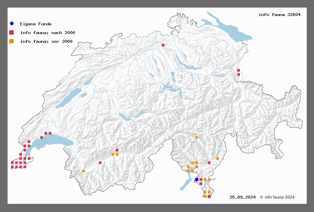 780. crinalis Tr. - Sp. III, T 55. Diese südliche Art ist wenig verbreitet und recht selten an warmen, geschützten Stellen des Jura, des Mittellandes und im Wallis zu Hause. Flugzeit im Mai-Juni. Zürich (Hug.), Lägern (Rühl), Oftringen, Engelberg, Born, Lenzburg (W.), Liestal (Seiler), Biel (Roh.), Landeron (Coul.), Neuchâtel (Roug.), Schupfen (V.), Bern (v. J.), Weissenburgschlucht (Hug.), Martigny (W.), Sion (Paul), Sierre (Roug.), Jäggi fand im Roseggtal ein (wohl vom Puschlav zugeflogenes) Stück. Die Raupe - Sp. IV, T 38 - lebt an Rubia tinctorum, Epheu und Rosen, aber auch an Sträuchern und Laubbäumen von August bis März. E. Sp. I, 328 - Favre 226 - Roug. 158 - Lamp. 210.