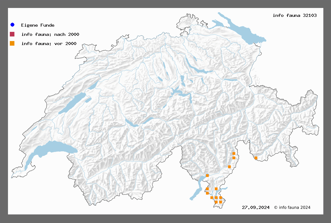 762. spectrum Esp. - Sp. III, T 54 - B. R. T 38. Falter fast nur in der Südschweiz: Tessin, Misox, Bergell; aber auch aus der Umgebung von Genf, so Pinchat (Prevost), Le Vallon (Held), Florissant (Rehf.). Er lebt von August bis März, zwar lokal, aber ziemlich häufig.