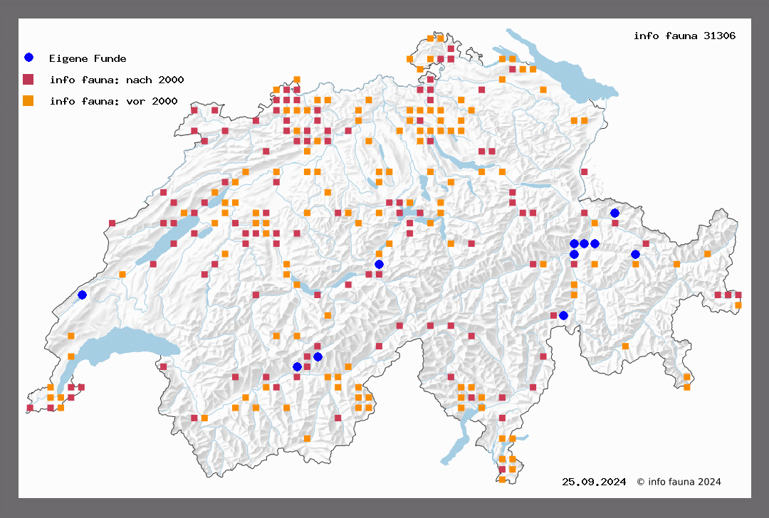 1161. aurautiaria Esp. {= quadripunctaria Esp.) - Sp. III, T 60 - B. R. T 45. Die gewöhnliche Erscheinungszeit dieser Art ist der Herbst, d. h. September bis November; ausnahmsweise fliegt der Falter aber auch von Februar bis April, vielleicht aus überwinterten Puppen. Er ist in den tieferen Teilen des Faunengebietes weit verbreitet, aber meist nicht gerade häufig. Ein Stück fing bei Davos (1574 m) Pfarrer Hauri, Ein hybrides Stück von Martigny erwähnt Wullschlegel. U. N. M. J. W. S. G.