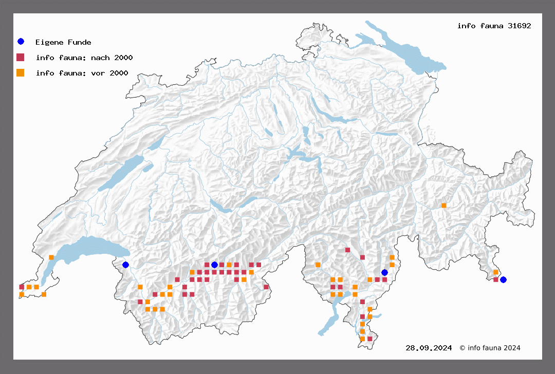 887. calabraria Z. Sp. III, T 58 - B. R. T 40 - Stz. IV, T 2. Viel südlicher und weniger verbreitet als vibicaria Cl. und nur an wenigen heissen, trockenen Stellen gefunden worden. Flugzeit im MaiJuni. Spino (Cafl.), Martigny (v. J.), Mont Chemin, Fully, Branson, Mont Ravoire (W.), Sion, Sierre (Paul), Brig, Gondo (Favre), Pte. Brolla, Biasca, Locarno (V.), Monte San Salvatore (Thom., v. J.), Promontogno, Lugano (Hauri), Mesocco (v. B., M.-R.). Die Raupe Sp. IV, T 40 lebt bes. auf Ginsterarten wie vibicaria Cl. E. Sp. II, 29 Frio. III, 262 Lamp. 223, T 66 B. R. 326.