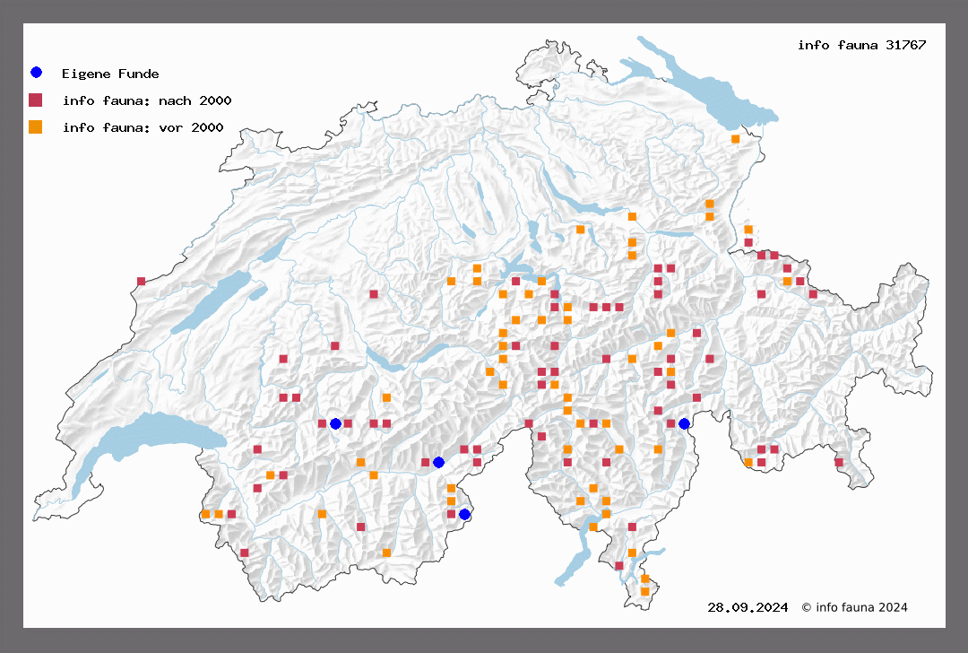 Prättigau, Klosters (Hauri, Gorti), Gais (P.-J.), Göschenen, J Stück (Uffeln). Die Raupe Sp. IV, Nachtr. T VII lebt im August-September an Sorbus aucuparia und Heidelbeeren. E. Sp. II, 46 Favre 287 Lamp. 233 B. R. 344.