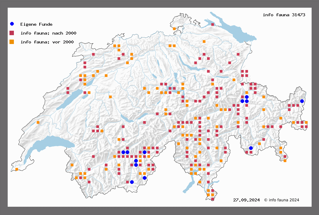 Salgesch (W.), La Forclaz (V.), Glaim, Varenalp (Roug.), Stalden (Wüsth.), von Zermatt bis Riffelalp gar nicht selten am Licht, auch an Felsen (Püng.), Findelen (Uffeln), Saas-Grund (Schultz), Brig (Favre), Simplon (Beut.), Fiesch (Ratz.), Ilanz (Caveng), Mühlen, Splügen (Honegg.), Davos (Schneider).
