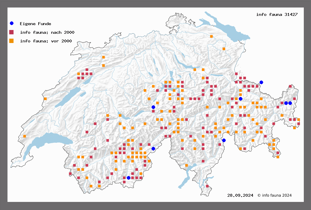 980. flavicinctata Hb. - Sp. IIT, T 68. Der Falter kommt im ganzen alpinen Gebiet, bes. in Lärchen- und Bergföhrenbeständen vor, selten auch im Jura, so bei Schaffhausen (W.-Sch.), der Bechburg (R.-St.), und an der Dole (Blach.). Er fliegt von Ende Juni bis Oktober und sitzt am Tage an Stämmen und Aesten. Höhenverbreitungan der Flüela bis 2400 m (Thom.), Klöntal (Nägeli), Calfeisental, Vättis selten (M.-R.), Landquart (Thom.), Erstfeld (L.), Weissenburgschlucht (Hug.), Gadmental (St.), Saleve, Pt.de Nant, Saas-Fee (Mong.), Mortheys (T. de G.), La Croix(Favre), Bovine. Arpilles, La Forclaz, Glacier de Trient, Mt.Chemiu (W.), Mayens de Sion (Paul), Val d'Anniviers, Leukerbad, Berisal, Laquintal (v. J.), Salgesch (Roug.), Zermatt (Püng.), Simplon (Ratz.), Gletsch (Gram.), Riffelalp, St. GotthardSüdseite (Ulfein). Die Raupe lebt vom Herbst bis Mai an Alchemilla montana, Saxifraga rotundifolia und petraea, aber auch an Weiden. Püngeler zog dieselbe aus dem Ei, anfänglich mit Rosenblättern, die Raupen überwinterten klein und erhielten nachder Ueberwinterung Sedum album. In merkwürdigem Gegensatz steht hiezu eine Notiz Wullschlegels: «Die Raupen verspannen sich im November und lieferten im warmen Zimmer die Falter schon im Januar». E. Stett. Ent. Zeitg. 1896, p. 2.37 - Favre 291 - Sp. II, 51 - B. R.348 - Frio. III, 251.