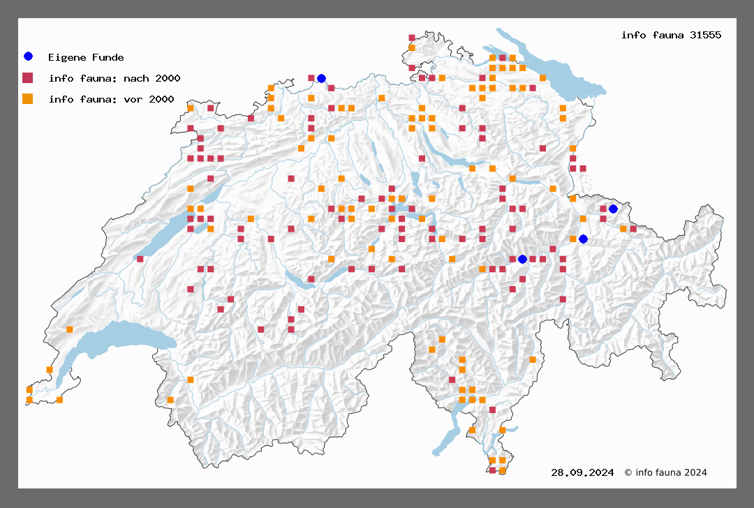 1017. testaceata Donov. (= sylvata Schiff.) Sp. III, T 69 B. R. T 43. Der Falter ist von der Ebene bis in die Alpentäler hinein sehr weit verbreitet, aber fast überall ziemlich selten. Flugzeit im Juni-Juli. Er ruht gerne an Fichten, von denen er geklopft werden kann. St. Gallen, Rheineck (M.-R.), Frauenfeld (Wehrli), Elgg (Gram.), Zürich, Engstringen (V.), Uto, Glattbrugg (Nägeli), Hönggerberg, Siggerberg (Weber), Bechburg (R,-St.), Liestal (Seiler), St. Blaise (V.), Yverdon (Roug.), Lattrigen, Siselen, Büren (Ratz.), Bern(V.). Weissenburgschlucht (Hug.), Gadmen (St.), Lechelles (T. de G.), Lausanne (Lah.), Genf (V.), Martigny (W.), Mayens de Sion (Paul), Pinsec bis 1800 m (Roug.), Ilanz (Caveng), Chur (Bazz.), Igis, Landquart und in viel grösseren Exemplaren von Lostallo im Misox (Thom.). Die Raupe Sp. IV, T 46 lebt im August September an Erlen, angeblich auch an Weissbuchen zwischen
