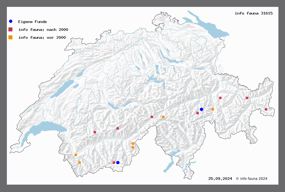1169. lapponarius B. - Sp. III, T 61. Diese Art ist in den Bergwäldern des alpinen Gebietes weit verbreitet und stellenweise nicht selten. Der Falter beginnt schon tief, so bei Pfäffers in etwa 900 m Höhe (Stdfs.) und erreicht im Engadin etwa 1900 m (Cafl.). Er fliegt von April bis Juni, je nach der Höhenlage. Ob. Engadin, Chur (Cafl.), Parpan (Thom.), Mühlen, Bergün, Splügen (Honegg.), Ilanz (Caveng), Andermatt (V.), Simplon (Roug.), Zermatt (Püng.). Die grünlichen Eier werden tief in die Risse rauher Lärchenrindenstücke hineingelegt; die Eiruhe dauert je nach