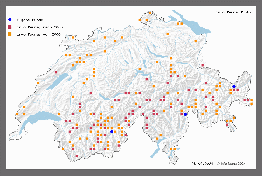 l003. transversata Thbg. (= lugubrata Stdg.) - Sp. III, T 69 - B. R. T 43. Im ganzen Lande verbreitet und bedeutend höher aufsteigend als die vorige Art. Der Falter ist in Bergwäldern manchmal scharenweise zu treffen, bis in etwa 1900 m Höhe (Albula, V.). Er fliegt im Mai - Juni und gelegentlich im August. Bes. grosse Exemplare traf ich im Tessin. Die Raupe - Sp. IV, T 46 - lebt von Juli bis Oktober an Epilobium montanum und angustifolium. Bei der Zimmerzucht schlüpften die Raupen aus anfangs Juli abgelegten Eiern nach 8 Tagen, sie wurden mit in Wasser gestelltem Epilobium angustifolium gefüttert. Ueber Tag ruhten sie an der Unterseite der Blätter und frassen nur nachts; nach 4 Wochen erwachsen, verspannen sie sich unter Moos. Die Puppen überwinterten; sie wurden im Frühling mehrmals tüchtig angefeuchtet; die Falter erschienen von Ende Mai ab. E. Ent. Zeitschr. 1891, Nr. 22. 23 - Soc. Ent. VII, 12 - Sp. II, 59 - Roug. 235 - Favre 296 - Frio. III, 260 - B. R. 354.