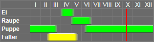sie bereits Mitte Juni zur Verpuppung in die Erde gingen. Die Puppen blieben im Freien bis Mitte Januar, wurden dann in das warme Zimmer genommen und lieferten die Falter in den ersten Februartagen. (Ent. Zeitschr. XIX, 12. 18). E. Sp. II, 99. 491 - Favre 254 - Frio. III, 102 - Ent. Zeitschr. XIX, 19 - Lamp. 261, T 75 - B. R. 397.
