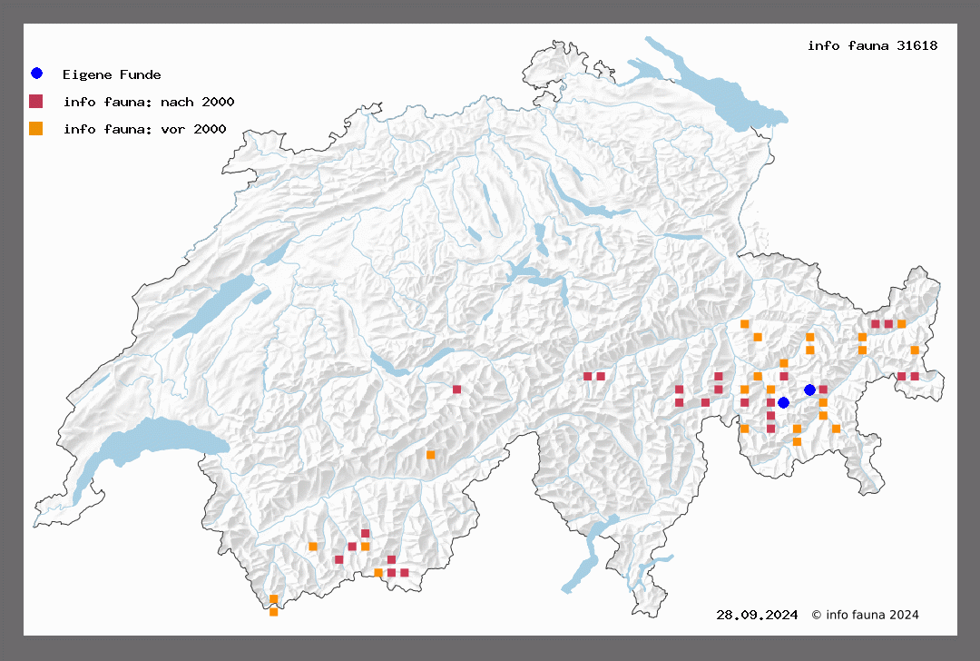 Die Art ist auf das Wallis, die Südschweiz und Graubünden beschränkt; sie kommt dort als Gebirgstier an zahlreichen Orten vor. Der Falter fliegt sofort nach der Schneeschmelze auf trockenen, heissen Abhängen, je nach der Höhenlage, von Mai bis Juli und geht bis über 2300 m. Val Moiry (Roug.), Riffelalp (Hoffm., v. J.), Col de Fenetre 25. VIT. 1907 (M.-Dürl.), Campo la Torba, Somvix, Cavloggio (v. J.), Bergün, Val Tuors, Oberengadin (Kill.), Berninapasshöhe (2330 m), am Fuss des Jacobshorn, Davos (Hauri), Muotas- Naluns ob Schuls (Stierlin), Capella ob Chur (Cafl.), Conters im Oberhalbstein 3. VI. 1901 (Thom.). Zeller fand die Eier bei Ponte auf Rumex scutatus. Die Raupe lebt aber auch auf andern Rumexarten, so acetosa. Sie ist unbeschrieben.