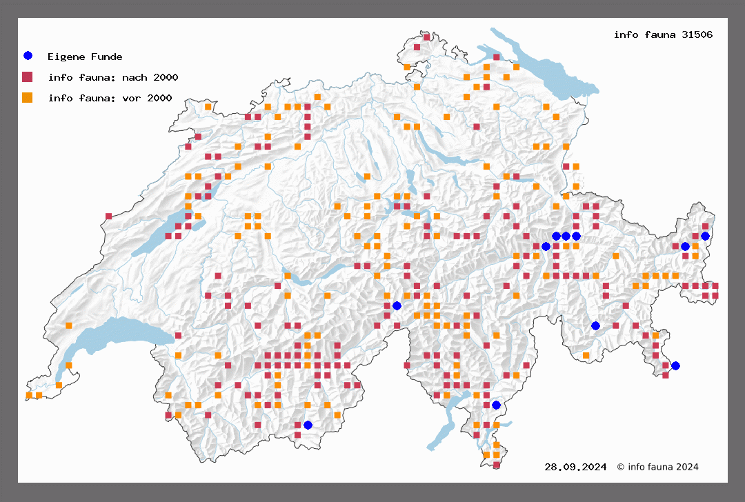 a) graeseriata Ratz. Mittig. S. E. G. 1882, 361 Dietze, Eupith. T 77. Grössere, mehr graue, individuell sehr veränderliche, meist weniger gezeichnete Gebirgsform. Es kommen Exemplare vor, welche in der schärferen Zeichnung der Herrich-Schäfter'schen expressaria (H. S. 284/5) genau entsprechen. St. Moritz, Pontresina (Püng.), Versam (Steck), Gadmen, Susten (Ratz.), La Forclaz, Glacier de Trient (W.), Gruben, in der Talsohle mehrfach (M.-R.), am Simplon höchst gemein, Zermatt in einer stärker gezeichneten und viel dunkleren Form (Püng.), in Göschenen am Lichte gar nicht selten (Uffeln).