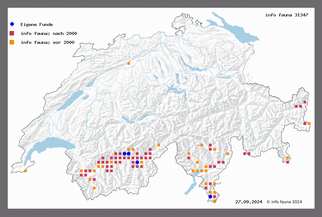 992. riguata Hb. Sp. III. T 69. Der Falter ist auf trockenen, heissen Stellen, namentlich des Wallis und der Südschweiz nicht sehr selten. Vereinzelt fand man ihn auch im Jura, so bei Schaffhausen (W.-Sch.), der Bechburg (R.-St.) und bei Basel (Knecht). Er fliegt von Ende April bis August, in 2 Generationen. Salvan (Favre), Martigny, La Croix, Fully, Branson (W.), Gamsen (And.), Stalden (V.), Evolena bis in 1400 m Höhe, Salgesch (Roug.), Grassier (Loriol), Arcine (Blach.), Tessin (Stierl.), Morcote (M.-R.), Lostallo (Thom.), Chiasso (Mayer), Calfeisental (M.-R.), Crevola (V.), Weissenburg (Hug.).