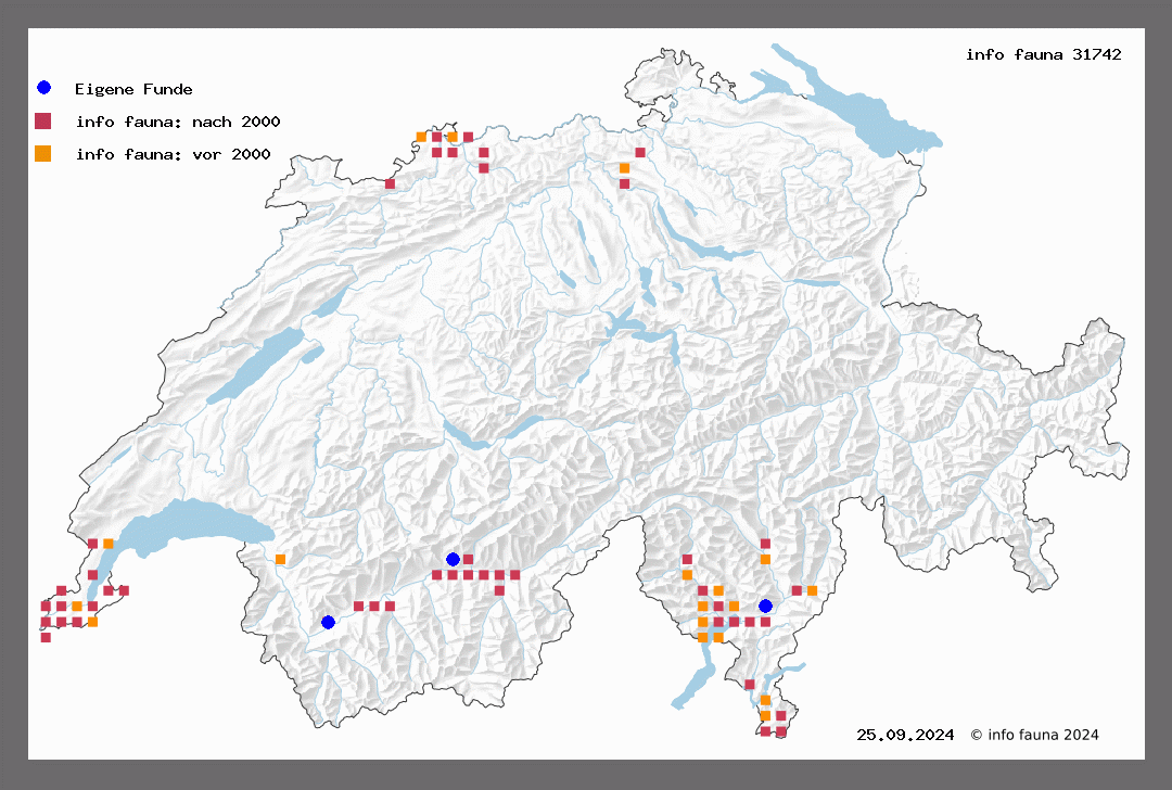Der Falter ist nur an wenigen Orten beobachtet worden. Er fliegt in 2 Generationen. Chiasso (Mayer), Cassarate 12. und 17. V. 1893 (Jäggi), Biasca (Schneider, V.), Porlezza am Luganersee (Püng.), Florissant 28. VIII. 1910 (Lacr.), Malagnou 21. II. 1887 (Blach.), Ft. Saconnex (Mong.), Berneroberland (Z.-R.); die frisch geschlüpften Falter sassen am 8. VII. 1905 sehr zahlreich an einem Lattenzaun auf der Alp Regenmoos im Simmental (ca. 1200 m, V.), Aargau (W.).