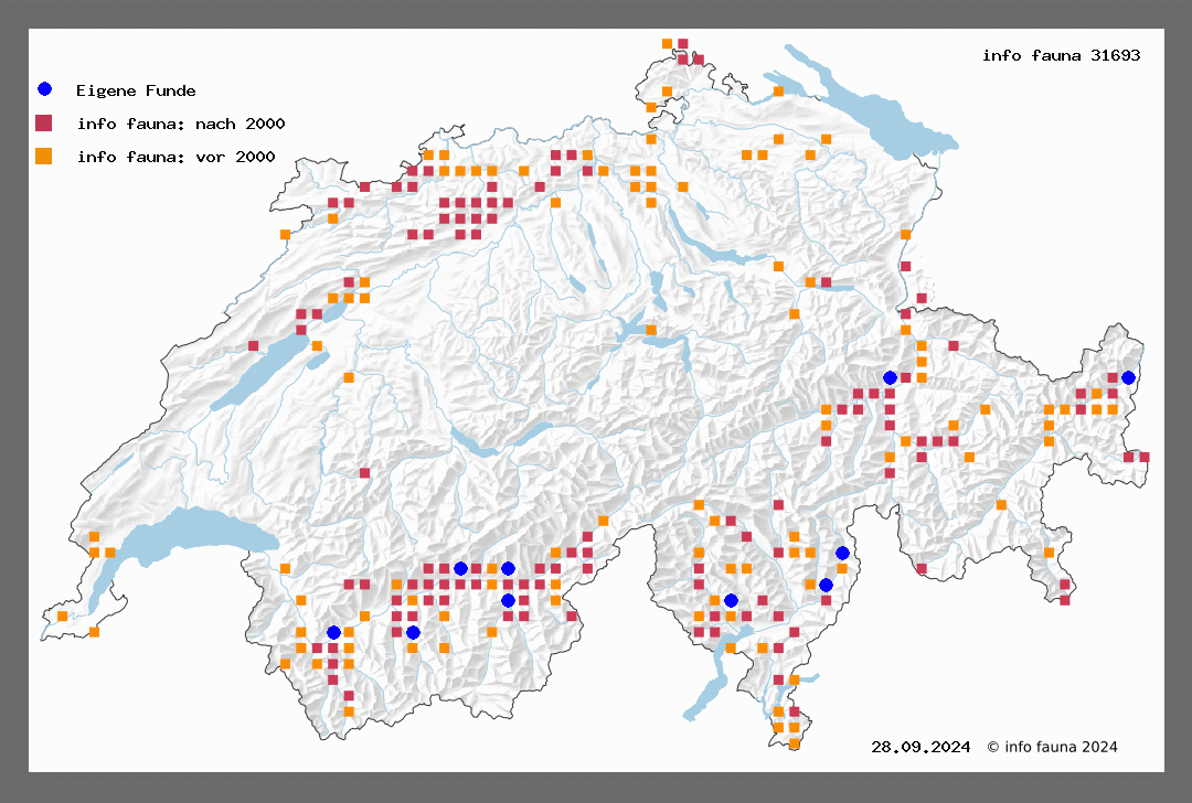 a) strigata Stdg. 3122 a) — Stz. IV, T 2. Die Querlinien sind nicht rot ausgefüllt. Unter der Art, bes. am Südfusse des Jura, so Bözingen und St. Blaise (V.); Basel (Leonh.), sodann aus dem Tessin von Biasca und Locarno (V.), Visp, Berisal (Ratz.), Martigny (v. B.), Promontogno 22. VII. 1911 (Uffeln).