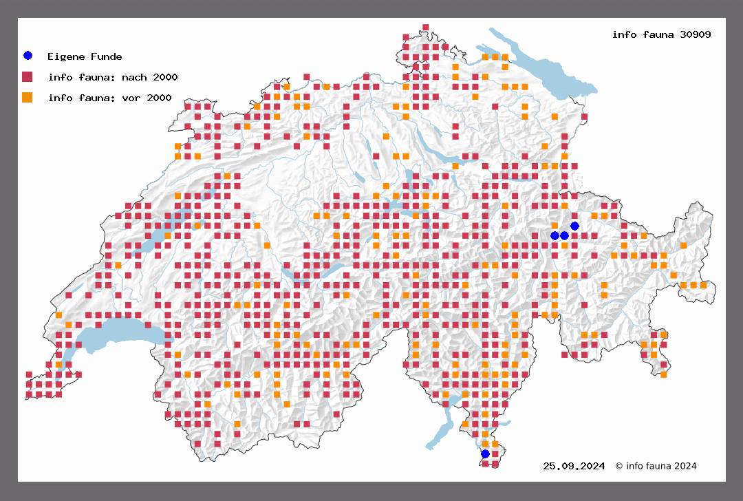 a) ? callunae Palm. - Stz. II, T 25. Das m hat in der Vfl-Wurzel einen grossen gelben Fleck, das w ist dunkler, fast braun, die Vfl-Binden beider Geschlechter sind schmaler, Übergänge zu dieser Form (das m von Landquart, das w aus dem Somvix) sandte mir Dr. Thomann. Dagegen hat sich die Notiz bei Roug. p. 69 als irrig herausgestellt. Angeblich auch von Basel (Leonh.).