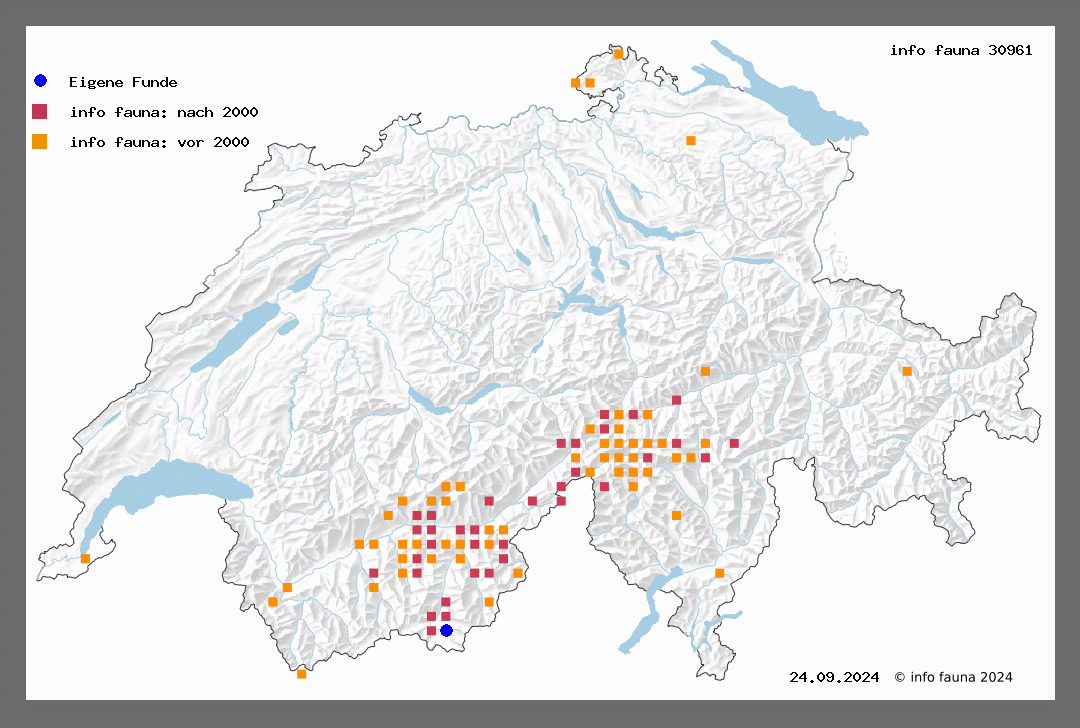 258. taraxaci Esp. - Sp. HI, T 27 - B. R. T 25. Der Falter ist als Seltenheit mancherorts beobachtet worden. Zürich (Z.-D.), Dischmatal (Hug.), Gotthard (Nägeli), Göschenen (Hoffm.), Andermatt (V.), Furka (Müller), Fusio (v. N.}, Bedrettotal (V.), Gletsch (Gram.), Simplon (Struve); bei Zermatt die mm nicht selten am Licht, bis Riffelalp (2227 m) aufsteigend (Püng.); Ried im Lötschental (Jullien), Gornergrat, Grimentz, Grächen, Turtmantal (Roug.), Arpilles (W.). Am 15. August 1899 am Randen ein totes w, ebendort am 5. Juni 1904 eine Raupe (W.-Sch.). Heimisch scheint der Falter nur in den Alpentälern des Wallis, Gotthard und Graubünden