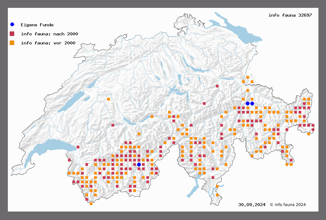 744. ain Hochenw. - Sp. III, T 50 - B. R. T 36. Diese schöne Art gehört nur dem alpinen Gebiet an, ist aber dort, soweit die Lärche gedeiht, verbreitet. Sie fliegt von Juni bis August im Sonnenschein, besonders gegen Abend, doch auch nachts am Licht. Der Falter ist meist ziemlich selten, aber ich fand ihn im Juli 1911 sehr zahlreich bei La Forclaz im Wallis. Höhenverbreitung von der Talsohle bis nahe an 2000 m. Vättis (M.-R.), Ragaz-Pfäffers (Kaiser), Fluchthorn (Thom.), Churwalden, Parpan (Gafl.), Ilanz (Caveng), Davos (Hauri), Silvaplana (Stdfs.), Pontresina (Jäggi), Bergün (Honegg.), Stelvio (Wocke), Thusis (V.), Gadmental (Ratz., St.), Fiescherwald (v. J.), Chandolin, Simplon (Favre), Zermatt (Püng.), Stalden, Berisal, La Forclaz, Arpilles, Glacier de Trient in Menge (V.), La Croix, Mt. Ravoire, Mt. Ghemin, Pierre à Voir (W.), Saas-Fee, Grimentz, Ponchette (Roug.). Die Raupe lebt von September bis Mai an Lärchen, besonders an niederen Aesten oder Stammauswüchsen. Die Eier werden an die Nadeln angeklebt und man erhält die jungen Räupchen Ende Mai durch Abklopfen. In der Gefangenschaft überwintern die Raupen an Lärchenzweige eingesponnen. Ende Februar oder im März fangen sie wieder an zu fressen, indem sie die Blattknospen benagen; bei der Zimmerzucht sind sie Ende April erwachsen. Die Falter erscheinen von Mitte Mai an. (Teicher, Ins. Börse IX, No. 15). Eine am 17. Mai 1910 gefundene, erwachsene Raupe spann sich am 19. ein und gab den Falter am 14. Juni. E. Sp. I, 305 - Stett. Ent. Ztg. 57, 229 - Favre 211 - Lamp. 202 - Zeitschr. f. wiss. Ins. Biol. VIII, 9.