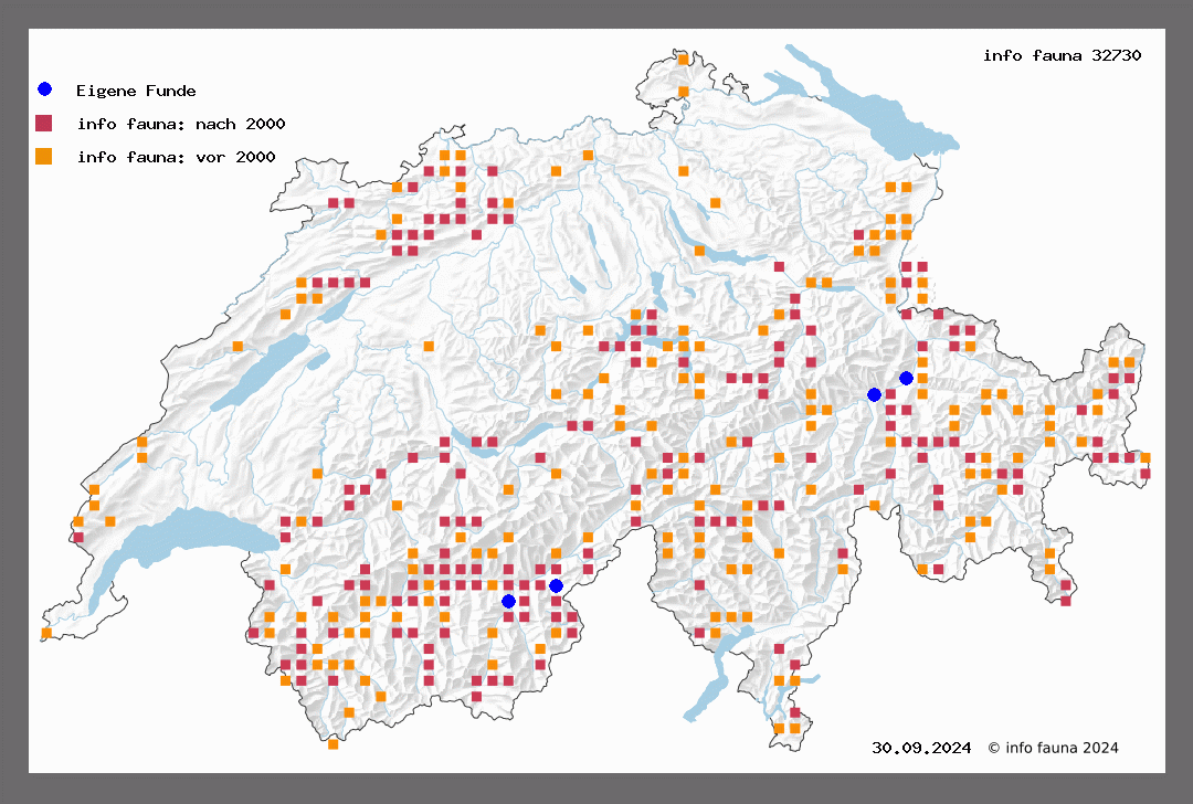 Der Falter ist oft, aber immer als vereinzelte Erscheinung, gefunden worden. Er fliegt von Ende Mai bis August und erreicht noch die Höhe von Arosa (1858 m, Stange). Eine dunkelgraue Form mit scharfen, schwarzen Querbinden, das ganze Tier manchmal grauschwarz, fand Bayer im Laquintal. Aadorf (Sulz.), Zürich (V.), Biel (Roh.), St.Imier. La Heutte, Sonnenberg, Moutier (G.), Dombressun (Roug.), Hauenstein, Belchen (W.). Neuveville (Goul.), Genf (Aud.), Weissenburgerschlucht (Hug.), Martigny (W.), Branson, Mt. Ravoire, Schallberg, Berisal (Favre), Salgesch (Roug.), Evolena (v. J.), Göschenen (Hoffm.), Vättis (M.-R.), Landquart, Disentis (Thom,). Ilanz (Caveng), Heinzenberg (Keller), Naiis (Kill.).