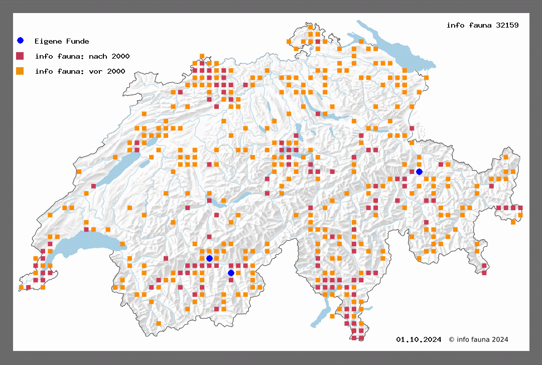 573. quadripunctata F. (= cubicularis S. V.) - Sp. III, T 44 - B. R. T 33 - Stz. III, T 45. Der Falter ist im ganzen Gebiet verbreitet und häufig, er geht in den Alpen bis über 2000 m und fliegt gerne zum Licht, er wird auch oft in Häusern gefunden. Flugzeit in der Ebene in 2 Generationen, von Mai bis September. Im Gebirge nur in einer Generation; so bei Zermatt, wo der Falter etwas reiner grau ist, zum Teil auch dunkler als in der Ebene, mit etwelcher Annäherung zur nordischen leucoptera Thbg. (Püngeler). Noch dunklere Exemplare mit fast schwarzen Vfl (laciniosa Donz.?) sind bei Lentine ob Sion erbeutet worden (Jullien). Die Raupe - Sp. IV, T 29 - lebt an Alsine media, Anagallis arvensis und anderen niederen Pflanzen, fast das ganze Jahr hindurch. Die Raupen der Sommer- (August-) Brut spinnen sich im Herbst ein, überwintern unverwandelt im Gespinst und ergeben im Mai-Juni die Falter. Sie lassen sich auffallend schwer treiben (Püng.).