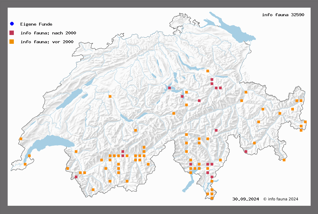 727. deaurata Esp. - Sp. III, T 49. Der Falter ist mehr auf die südlichen Landesteile beschränkt und fliegt von Ende Mai bis August, bis etwa 1600 m Höhengrenze. Selten. Yverdon, St. Aubin (Roug.), Conche (Aud.), Hermance (Dr. Roche), Martigny, Planuit, Mt. Ravoire, Saillon (W.), Sion, Sierre (Paul), Zinal, Grimentz (Roug.), Hutecken, Zermatt (v. J.), dort nur zweimal aus der Raupe erzogen (Püng.), Lugano, Vicosoprano (v. J.), Locarno (Roug.), Gotthard (Gröbli), Landquart (Thom.), Banz (Caveng), Bergün (Stierl.), Bernina (Kill.), Bormio (Landolt). Die Raupe - Frr. III, T 196 - lebt von April bis Juni an Thalictrum foetidum, flavum, minus und aquilegifolium in die Blätter eingesponnen. Die im April 1900 jung gefundenen Raupen spannen sich Ende Mai ein, ergaben die Falter vom 21. Juni an; am 13. Juli fand ich neuerdings Raupen in zweiter Generation (Wullschl.). E. Favre 207 - Lamp. 199 - Sp. I, 300 - Roug. 145.