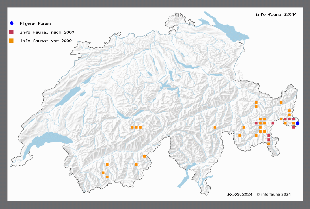 Das hochalpine Tier ist in den Berner- und Graubündneralpen an zahlreichen Orten gefangen worden und kommt auch im Wallis vor. So im Saastal (Favre), Steingletscher (V.), Gadmen (St.), Wengernalp (W), Murren (Benteli), Stelvio (Wocke), Oberengadin (Z.), Silser- und Celerineralpen (Frey), Muottas-Muraigl (Jäggi), Albulahospiz (Honegg.), Weissenstein (Lutschg). Diese schönste aller Agrotisarten ist an den Orten ihres Vorkommens nicht gerade sehr selten, das m fliegt gerne ans Licht, das w muss im Grase und an Steinen gesucht werden, wo es seiner halbausgebildeten Flügel halber nur wenig beachtet wird. Nach Standfuss haben die dunkelsten, fast schwarzbraunen ww die kleinsten und rudimentärsten, die hellgrau gefärbten die am vollkommensten ausgebildeten Flügel. Höhenverbreitung zwischen 1800 und 2700 m (Gornergrat,