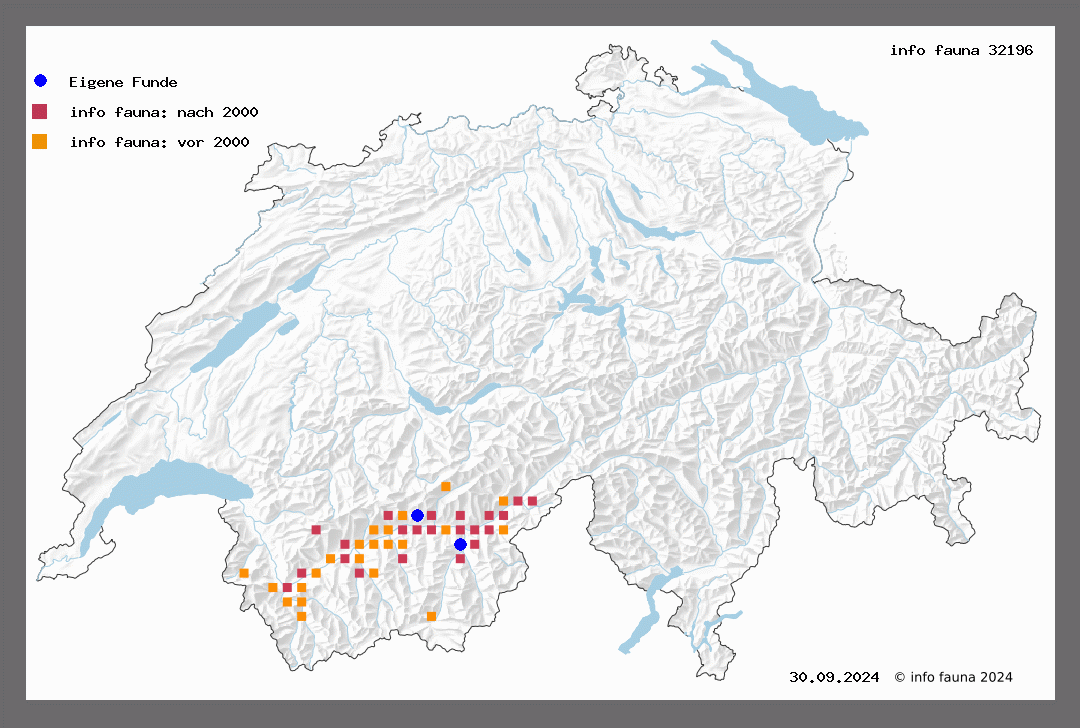 Der Falter fliegt von Juni bis August und ist im Aargauer-Jura, sodann besonders im Wallis zu Hause. Dort in weiter Verbreitung durch die Talsohle. Rossetan, Martigny, Branson (W.), Sierre, Sion (Paul), Evolena, Useigne (Steck), Gamsen, Saastal, Mt. Ravoire (Favre), Zermatt (Jäggi), Engadin,(Wagner).
