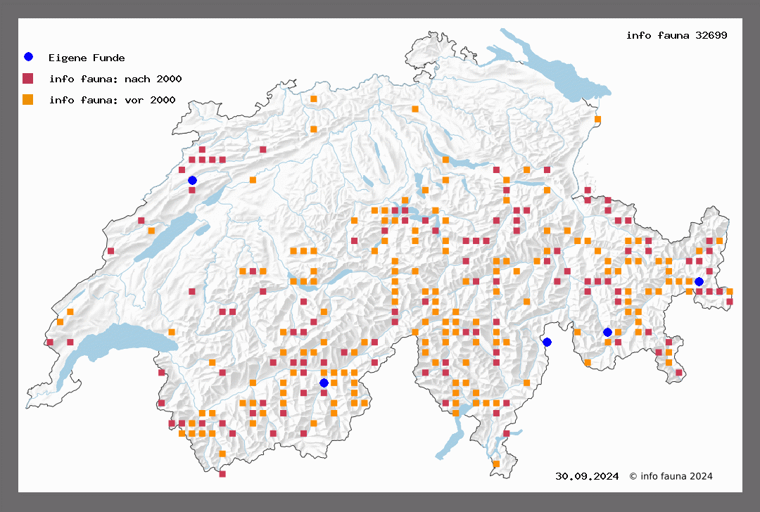 Vättis selten (M.-R.), Stelvio (Müller), Caumasee, Davos (Hauri), Tarasp (Kill.), Sils (Z.), Gd. St. Bernard, Chandolin (Favre), La Forclaz, Glacier de Trient (W.), Turtmantal (Roug.), Moulin de la Gruyere (G.), Pontins (Roug.), Burgdorf (Müller), Schupfen (Rothb.), Bremgarten (Boll), Pilatus (W.), Uto (Nägeli).