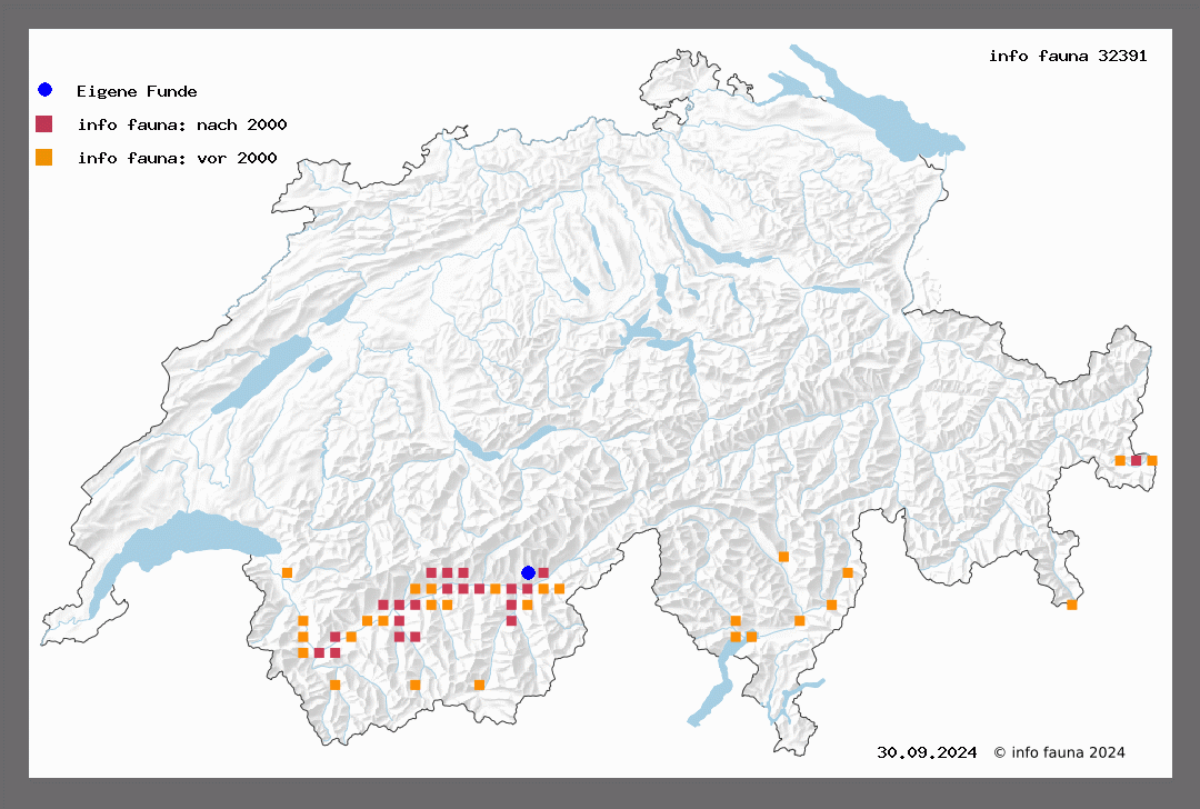 Der auffallende Falter fliegt von Ende April bis anfangs Juli, ausnahmsweise auch im August. Er ist an heissen, sonnigen Abhängen des Wallis weit verbreitet und stellenweise häufig, über Tag ruht er meist an den Blüten der Silene otites, wo er mühelos in Mehrzahl abzunehmen ist. Fliegend sah ich ihn nur in den heissesten Mittagsstunden und Nachts am Licht. Er geht bis etwa 1300 m Höhe (Schallberg, Favre). Follaterres, Branson, La Batiaz, Saillon (W., V. J., V.), Mt. Ravoire (Favre), Siders (Paul), Salgesch (Roug.), sodann am 11. VIII. 1911 bei Lostallo am Licht (Thom., M.-R.) und angeblich von St. Aubin (Roug.).