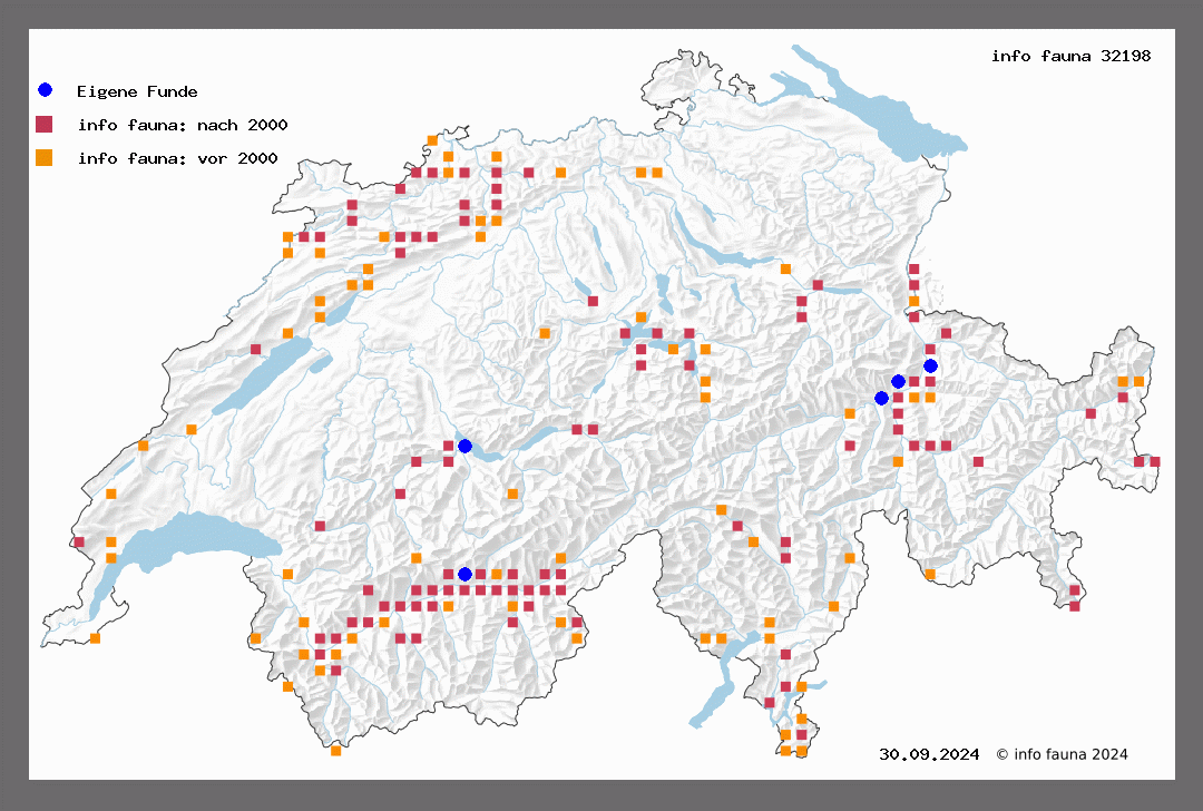 Vorkommen ähnlich der vorigen Art, aber eher etwas weniger spärlich. Flugzeit von Juli bis September. Bechburg (v. J.), Biel (Roh.), Neuveville (CouL), Neuchätel (V.),