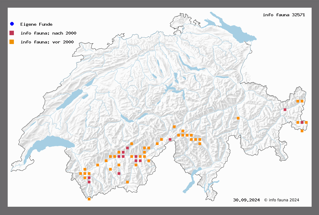 Der Falter wird meist, selten und vereinzelt gefunden; Flugzeit von Juni bis September. Er erreicht bei Zermatt 1620 m Höhe (Püng., Sulz.), Bechburg (R.-St.), Tramelan (G.), St. Blaise, Dombresson (Rong.), Neuveville (Coul.), Martigny (W.), Mt. Ravoire, La Croix, Martigny-Combe (Favre), Thusis (V.), Salgesch (Roug.), Genf (Aud.), Aarburg, Born, Wartburg (W.).