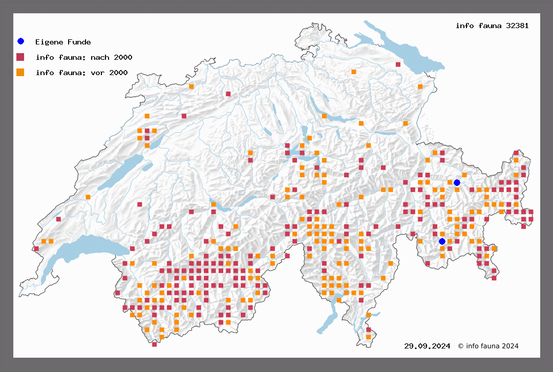Falter nur im Jura und den Alpen von Juni bis September, sehr weit verbreitet und in manchen Jahren sehr häufig. Er geht im Wallis bis nahe an 2500 m. Einmal von Zürich (Rühl.). U. J. 0. W. G.