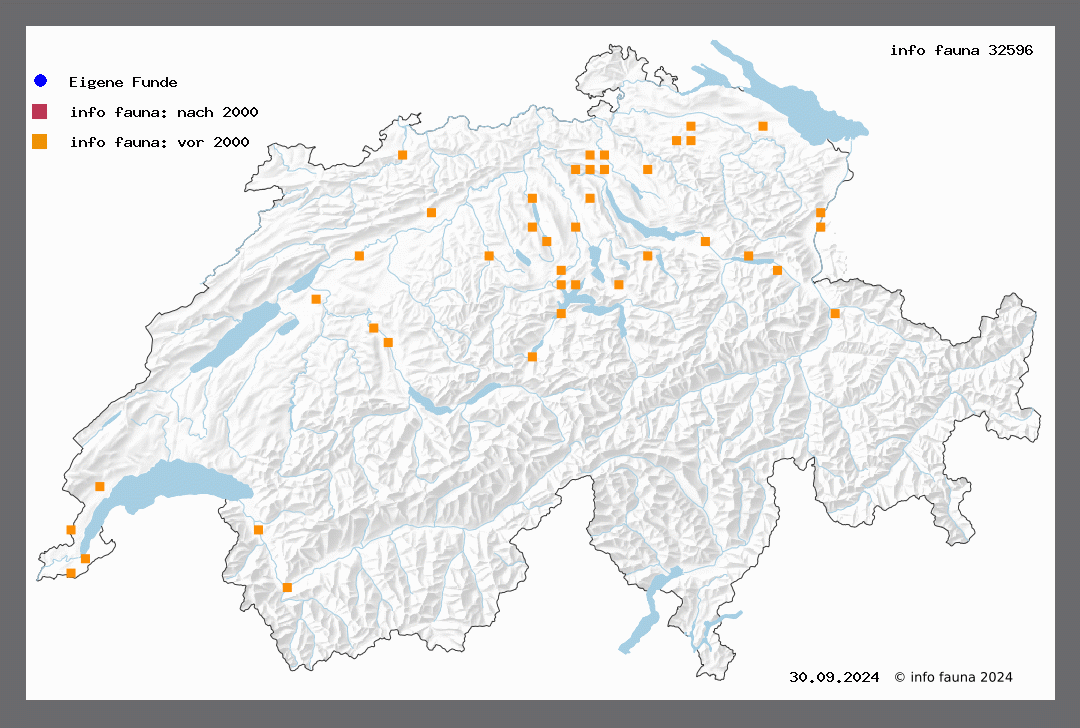 Der seltene Falter ist gefunden bei Zürich (Nägeli, V.). Siselen, Büren (Ratz.), Bucheggberg (Jäggi), Wildegg, Unterkulm, Elgg (Gram.), Engelberg, Gysulafluh (W.), Bern (V.). Frauenfeld (Wehrli), Dombresson (Bolle), Tramelan (G.), Gadmental (v. B.) und aus dem Wallis von Naters (Jäggi), aber überall als Seltenheit. Flugzeit im Juni-Juli.