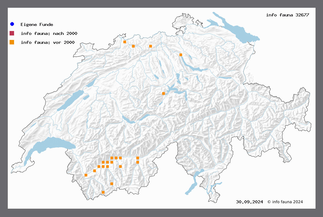 Wiederum ein seltenes und nur von wenigen Orten bekannt gewordenes Tier. Engelberg, Eigenthal (W.), Sissach (Müller), Mt. de Fully, Martigny (W.), Weissenburgerschlucht (Hug.), Sion, Sierre (Paul), Iselle (Püng.). Flugzeit im Juni-Juli.