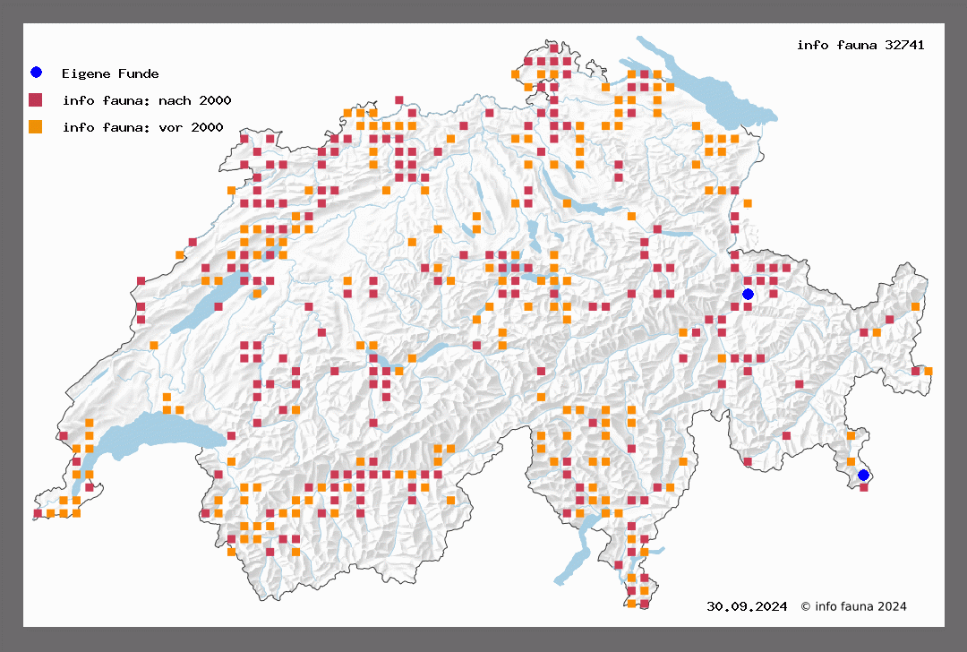 Verbreitung und Erscheinungszeit stimmen mit denjenigen der vorigen Art überein, aber der Falter ist seltener und mehr auf die ebeneren Landesteile beschränkt. St. Gallen (M.-R.), Schaffhausen (W.-Sch.), Frauenfeld (Wehrli), Zürich (V.), Burgdorf (Müller), Liestal (Seiler), Dombresson (Roug.), Büren (Ratz.), Bern (v. J.), Conche (Aud.), im ganzen Rhonetal nicht selten (W., Favre), Weissenburgerschlucht (Hug.), Bremgarten (Boll), Oftringen, Beleben, Lenzburg (W.).